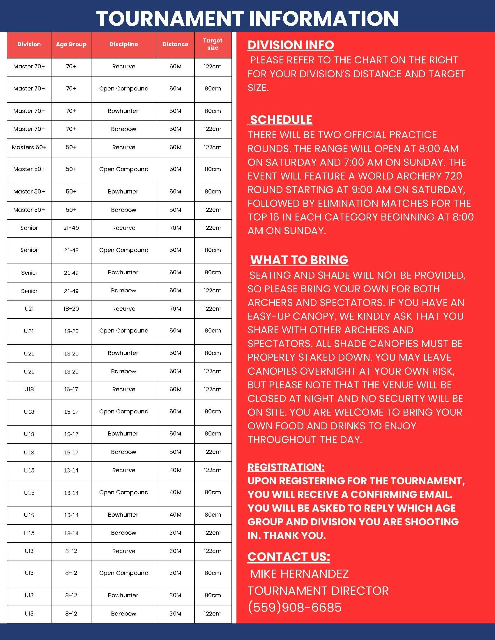 This will be a World Archery 720 Outdoor Round with single eliminations for the Top 16 of each bracket.